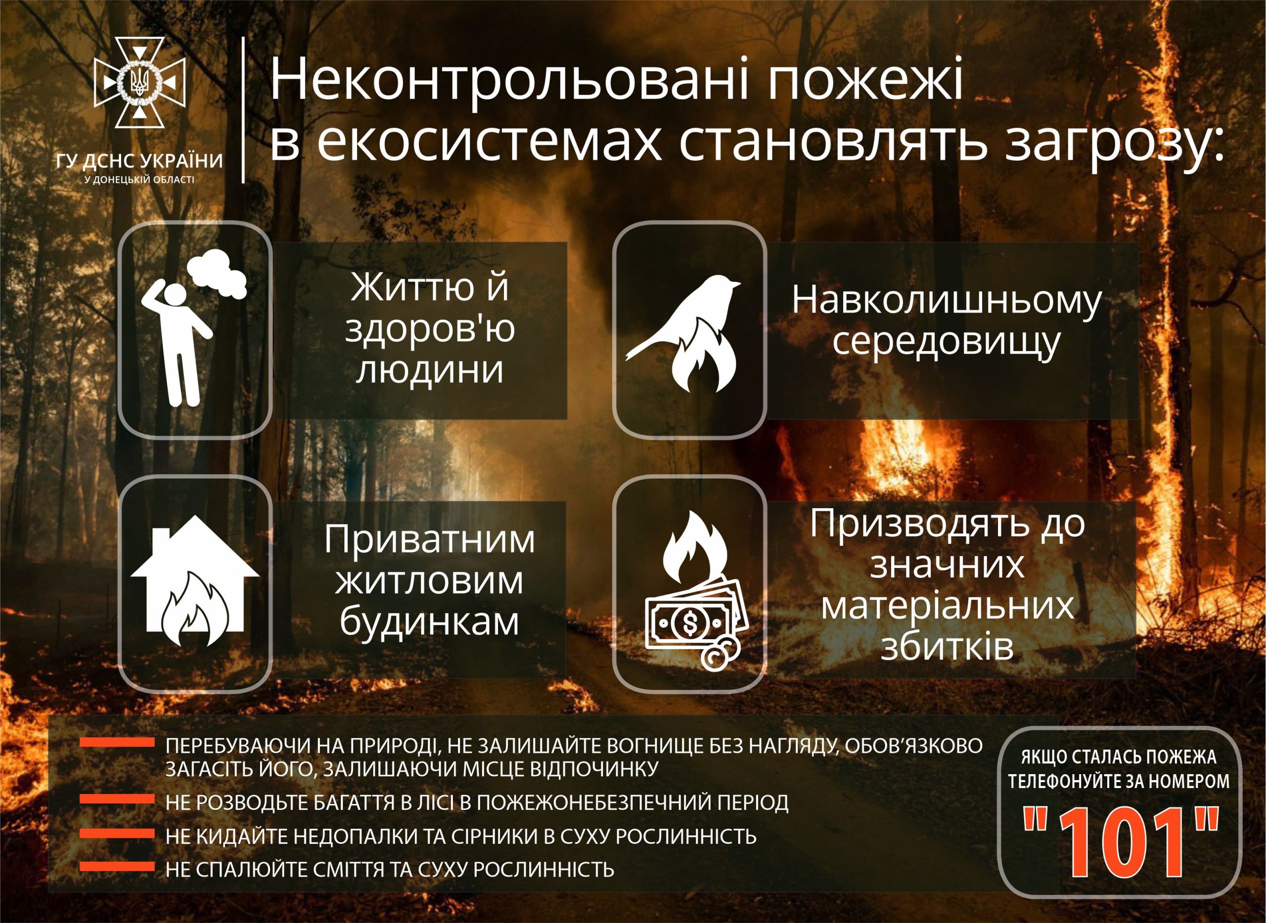 Не спалюйте суху рослинність і сміття на відкритих територіях та не допускайте виникнення пожеж.
