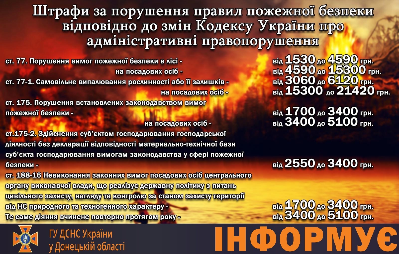 Нагадуємо громадянам, що відповідно до ст. 77-1 КУпАП випалювання стерні, луків, пасовищ, ділянок із степовою, водно-болотною та іншою природною рослинністю, рослинності або її залишків та опалого листя на землях сільськогосподарського призначення, у смугах відводу автомобільних доріг і залізниць, у парках, інших зелених насадженнях та газонів у населених пунктах без дотримання порядку, встановленого центральним органом виконавчої влади, що забезпечує формування державної політики у сфері охорони навколишнього природного середовища, тягнуть за собою накладення штрафу на громадян від 3 060 грн до 6 120 грн і на посадових осіб – від 15300 грн до 21420 грн.