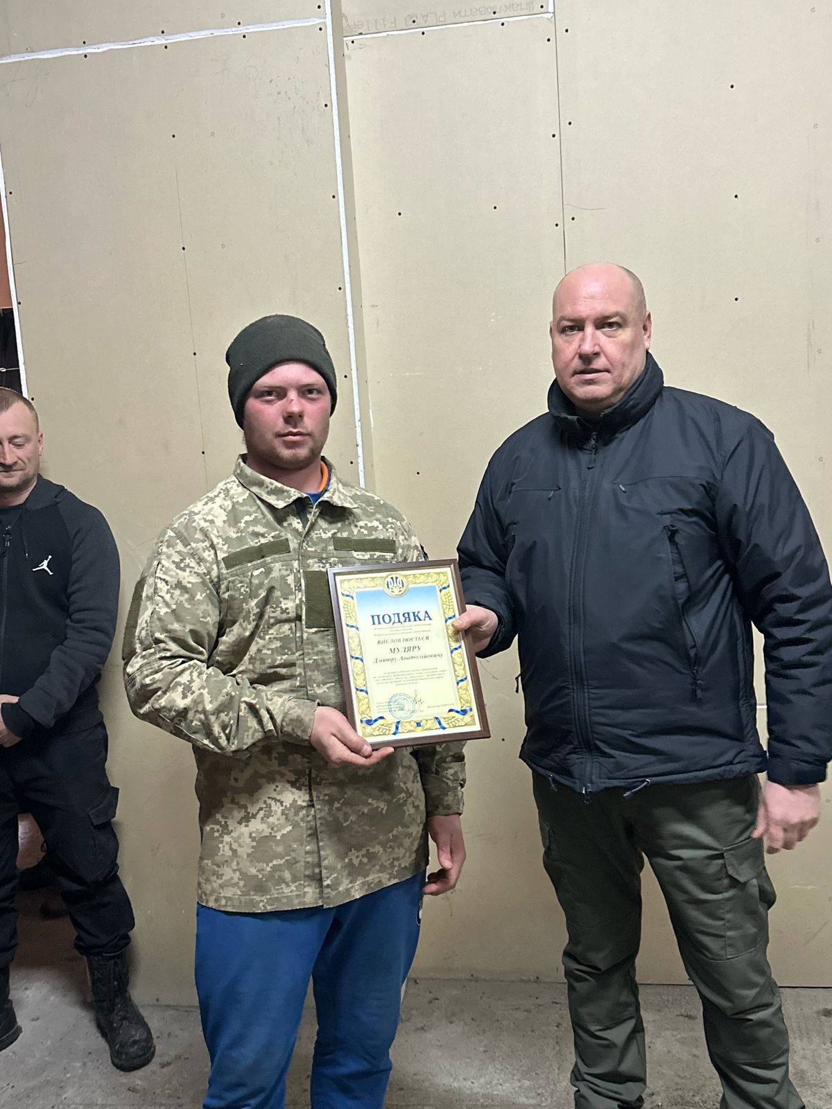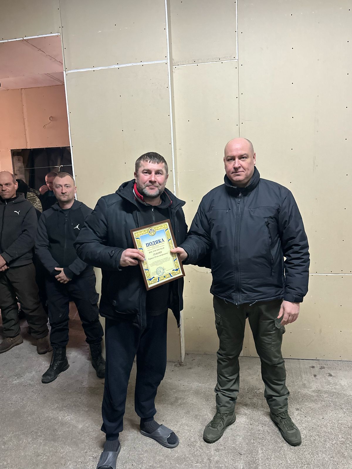 За вагомий особистий внесок в спорудження та обладнання фортифікаційних, інших інженерних споруд для здійснення відсічі та стримування збройної агресії російської федерації на території Покровського району Донецької області вручили Подяки Донецької облдержадміністрації, Покровської райдержадміністрації та Криворізької сільської військової адміністрації.