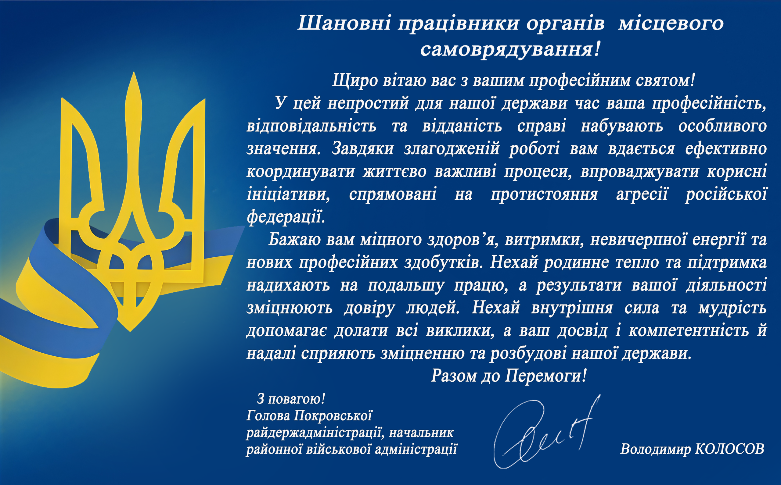 Привітання до Дня місцевого самоврядування голови Покровської райдержадміністрації, начальника районної військової адміністрації Володимира Колосова