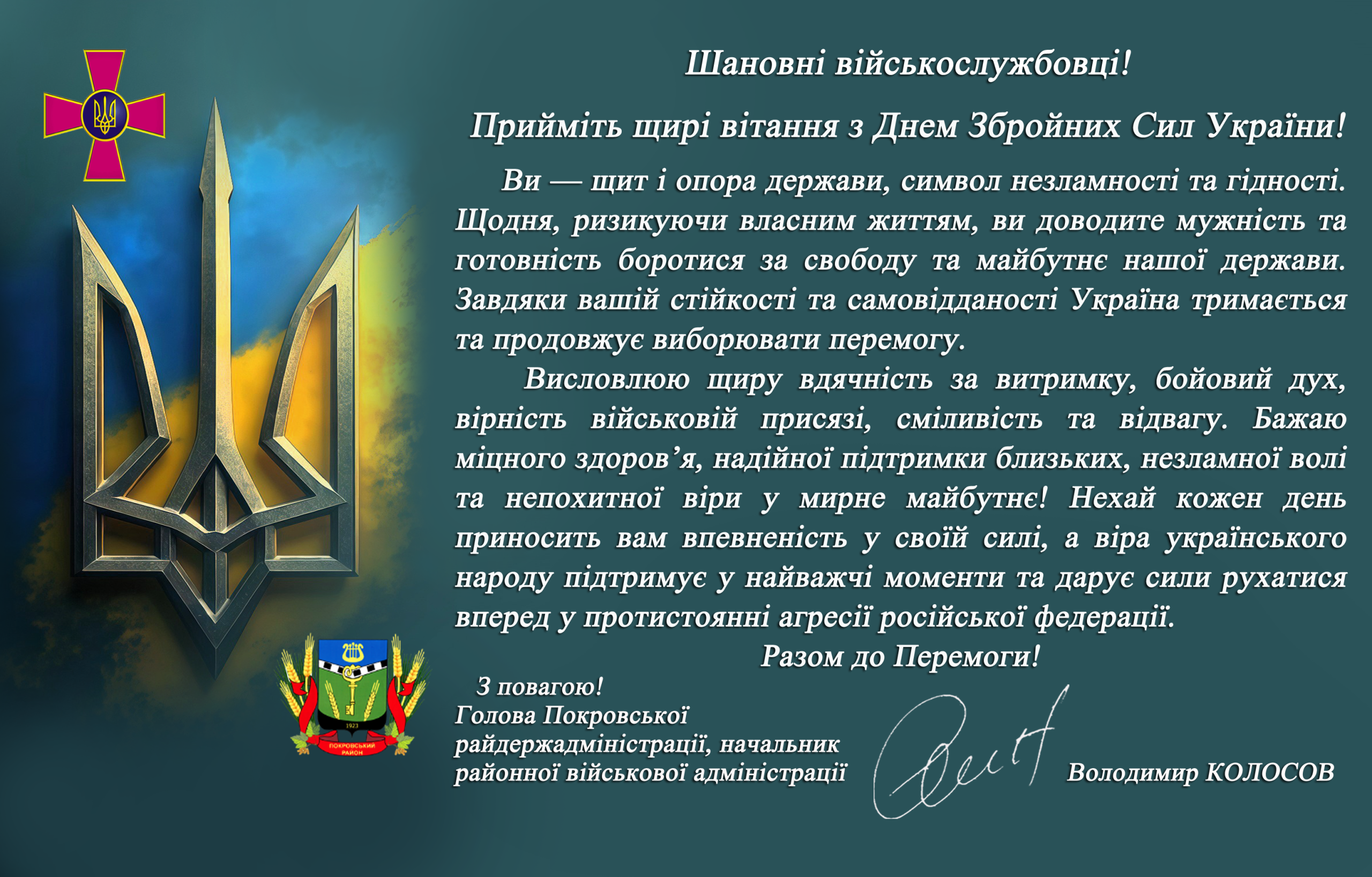 Привітання до Дня Збройних Сил України голови Покровської райдержадміністрації, начальника районної військової адміністрації Володимира Колосова