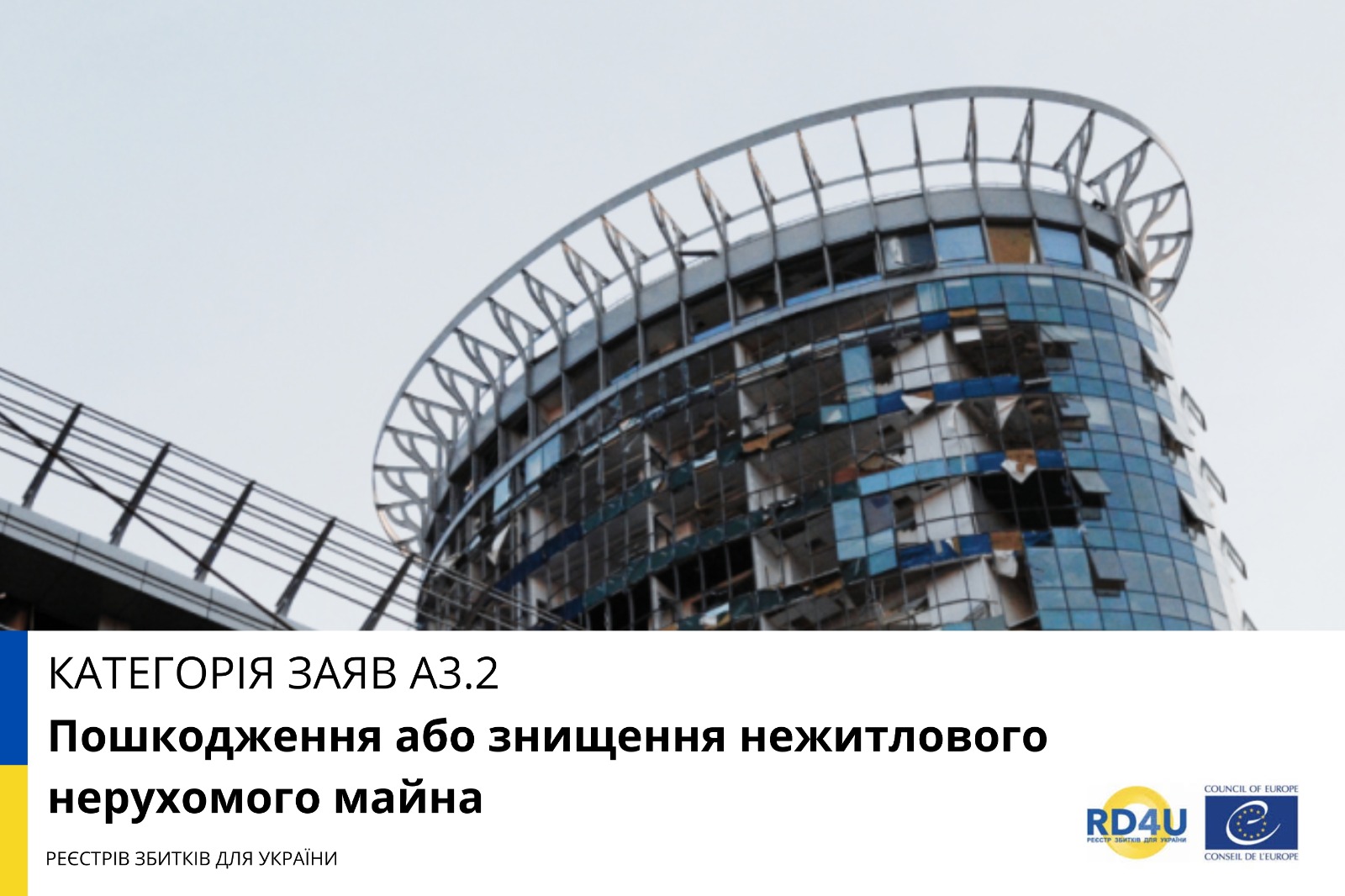 15 травня 2025 року у Реєстрі збитків відкрито нову категорію заяв – А3.2 «Пошкодження або знищення нежитлового майна». Ця категорія призначена для фізичних осіб – власників нежитлового нерухомого майна в Україні, яке було пошкоджене або зруйноване внаслідок повномасштабного вторгнення Росії, починаючи з 24 лютого 2022 року.