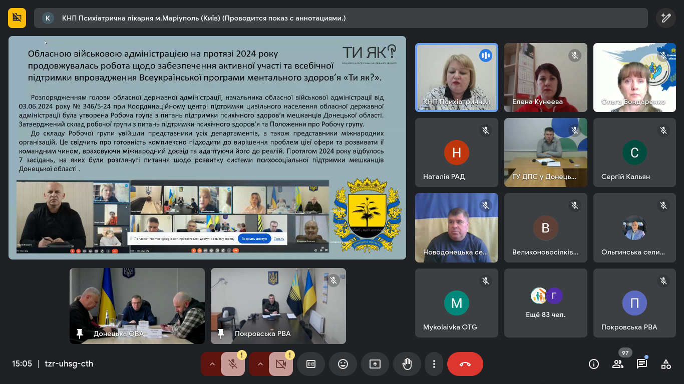 Під час засідання розглянули питання щодо виконання регіонального плану заходів з реалізації на території Донецької області Концепції розвитку охорони психічного здоров’я в Україні за 2024 рік та плани на 2025 рік. Звернули увагу також і на окремі питання, пов’язані з оформленням документів на території Донецької області під час дії воєнного стану. Крім того обговорили проєкти підтримки вразливих категорій населення, які були реалізовані у 2024 році та плани роботи на 2025 рік.