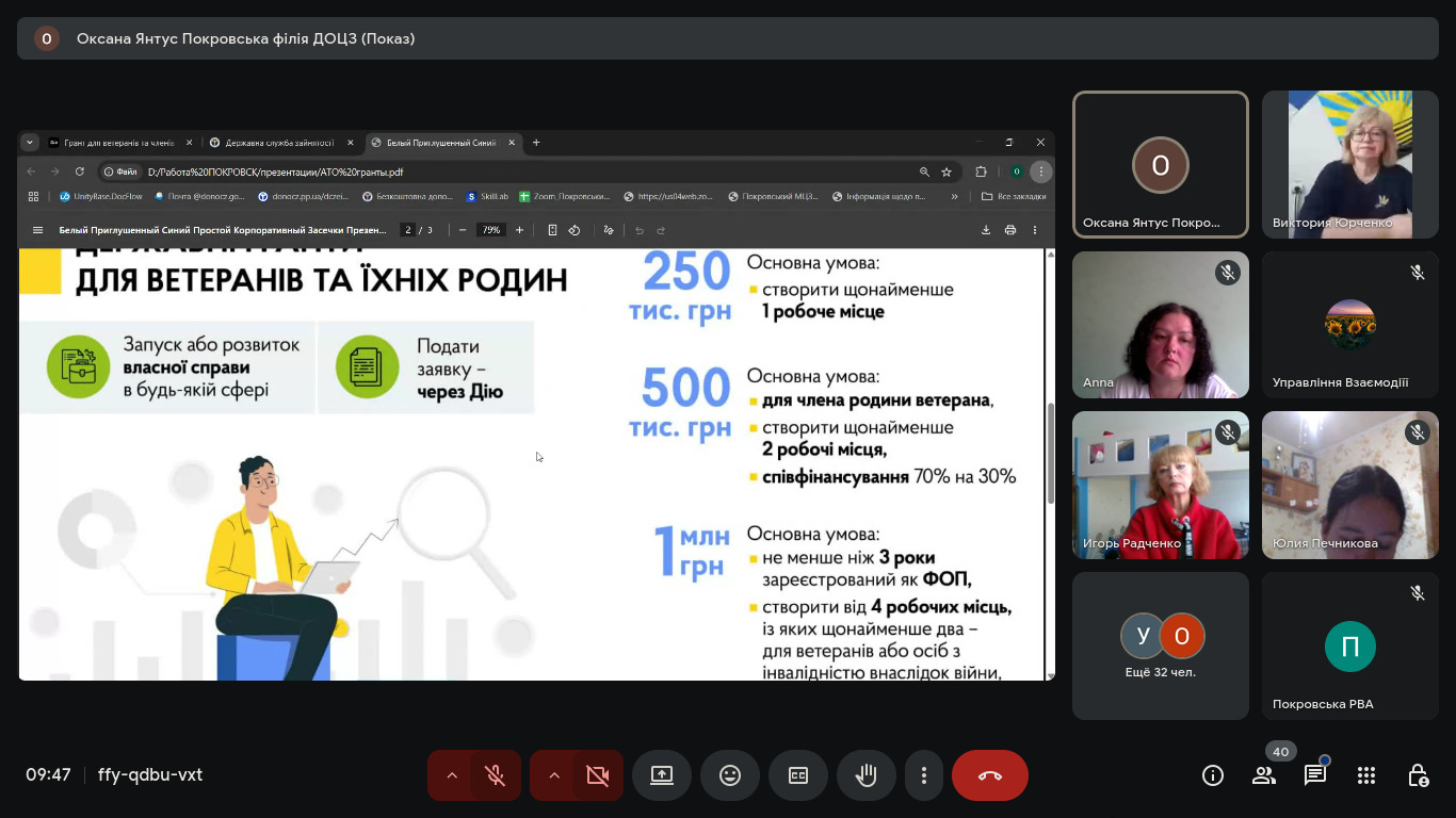 Провідний фахівець з профорієнтації сектору профорієнтації та психологічної підтримки у складі відділу працевлаштування Покровської філії Донецького обласного центру зайнятості Оксана Янтус ознайомила присутніх з грантовими можливостями для ветеранів, ветеранок та членів їх сімей.