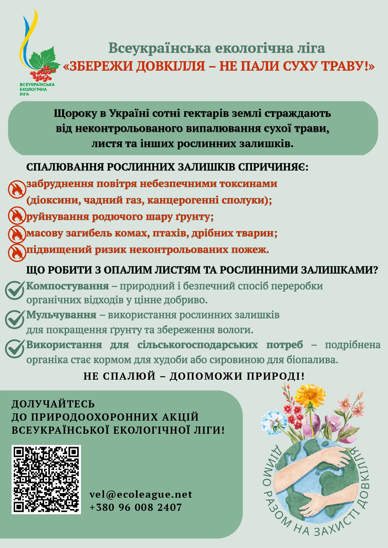 Закликаємо Вас долучитися до акції «Збережи довкілля – не пали суху траву», яку розпочала громадська організація Всеукраїнська екологічна ліга. Метою акції є поліпшення екологічної ситуації в Україні формування засад збалансованого (сталого) розвитку, нового природоохоронного світогляду, підвищення рівня екологічної освіти та культури громадян, привернення уваги громадськості до небезпеки спалювання сухої трави, листя та інших рослинних залишків, а також популяризації екологічно безпечних способів їх утилізації.