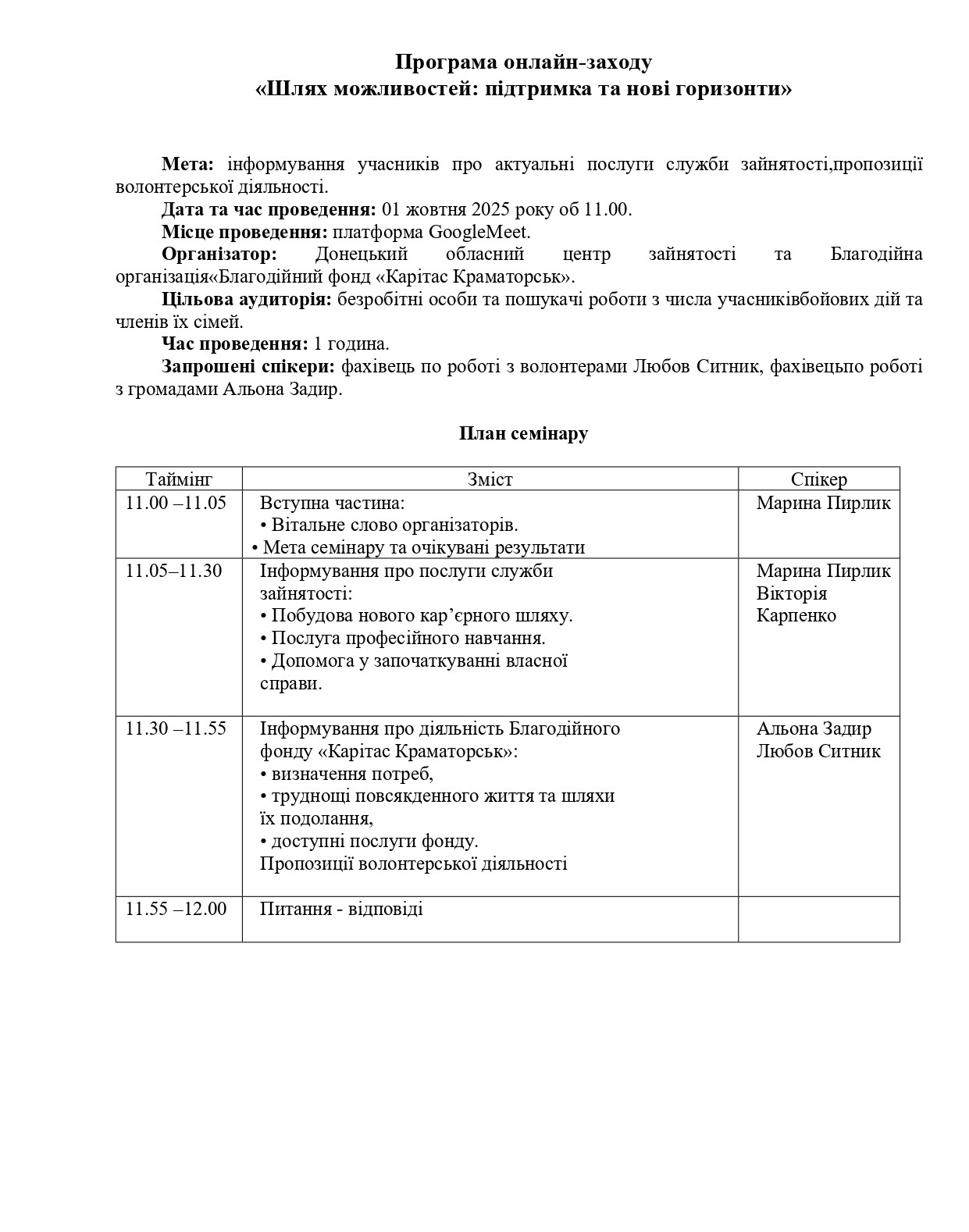 У програмі зустрічі передбачено виступ запрошених спікерів – представників Благодійної організації «Благодійний фонд «Карітас Краматорськ». Програма додається. Посилання для підключення https://meet.google.com/ksq-tqff-hms