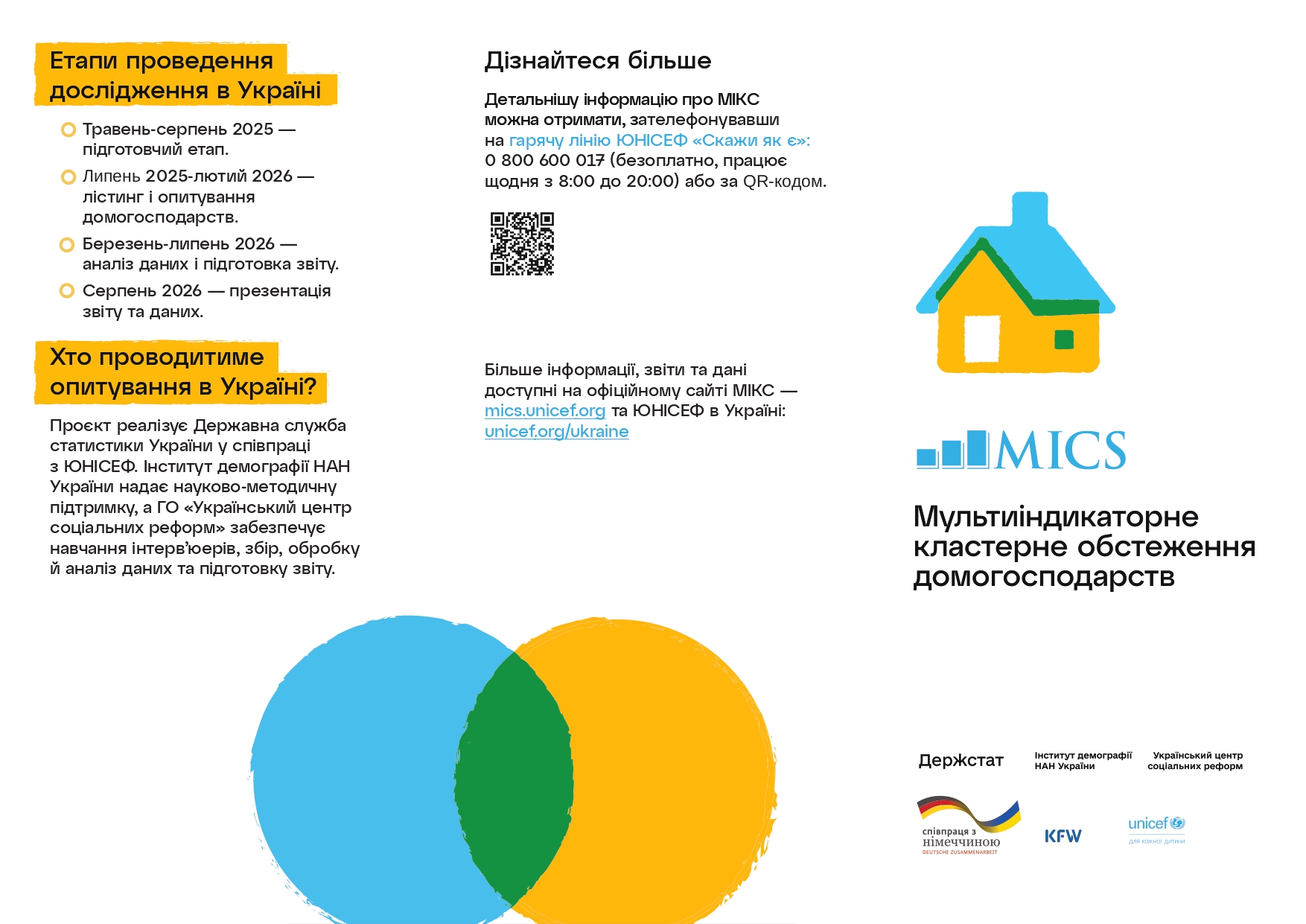 У 2025–2026 роках Державна служба статистики України спільно з Інститутом демографії та досліджень якості життя імені М. В. Птухи НАН України та ГО «Український центр соціальних реформ» за підтримки ЮНІСЕФ в Україні проводить Мультиіндикаторне кластерне обстеження домогосподарств (МІКС).