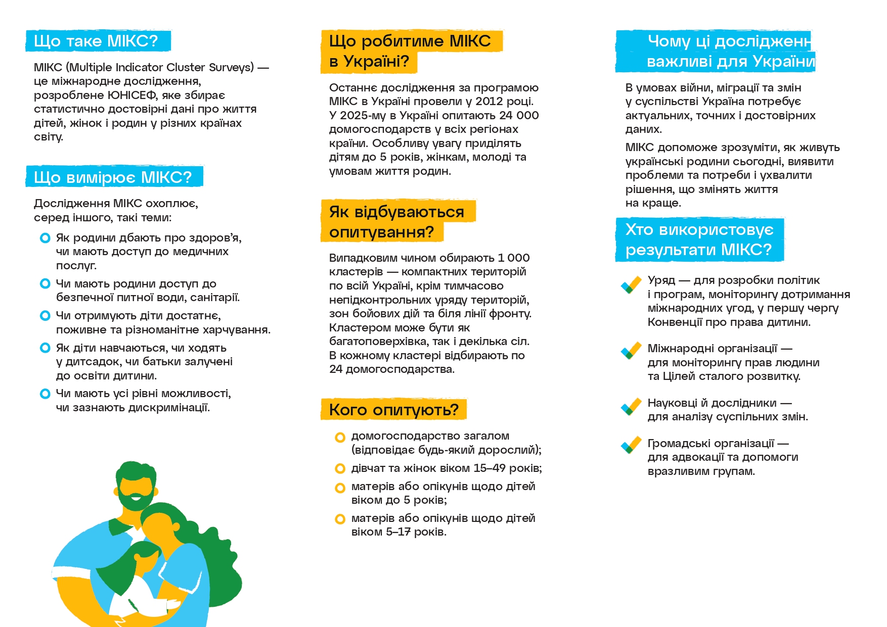 МІКС — це міжнародне дослідження, розроблене Дитячим фондом ООН (ЮНІСЕФ), яке забезпечує збір статистично достовірних даних про становище дітей, жінок і сімей у різних країнах світу. В Україні таке обстеження проводиться вперше за останні 12 років.
