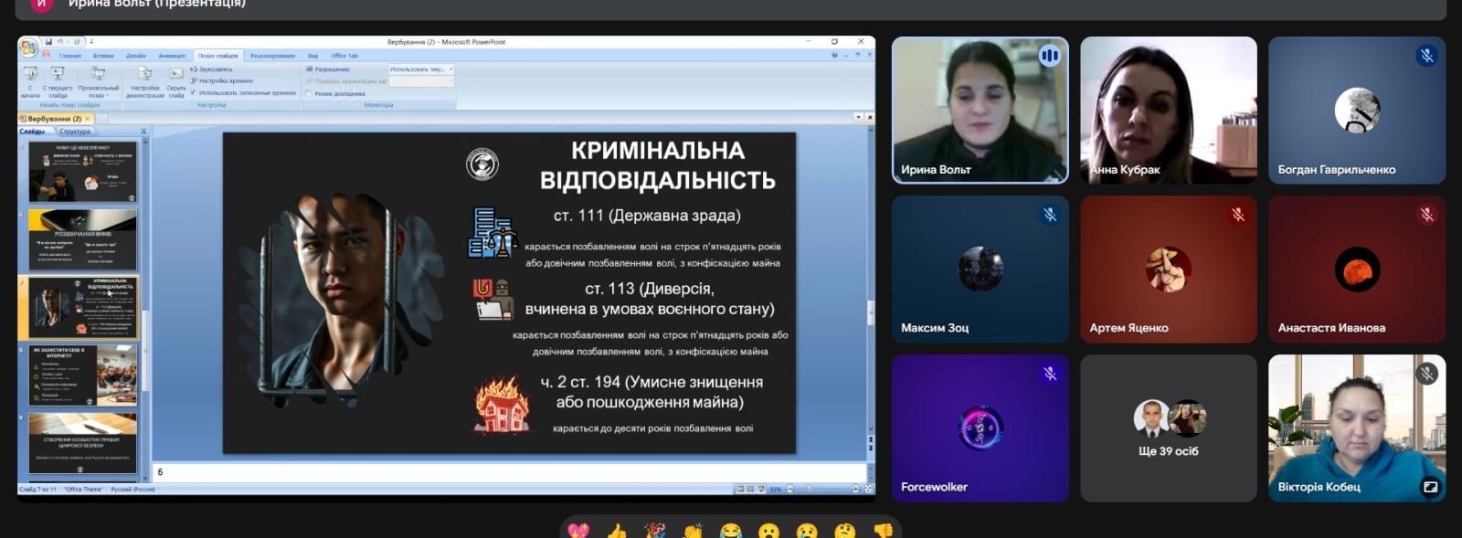 29 жовтня 2025 року, з метою підвищення правової обізнаності молоді та формування у них відповідального ставлення до національної безпеки держави,  для  учнівської молоді Покровського професійного ліцею в режимі онлайн було проведено виховну годину  представниками відділу пробації м. Покровська та сектору ювенальної превентивної діяльності Покровського РУП в Донецькій області.