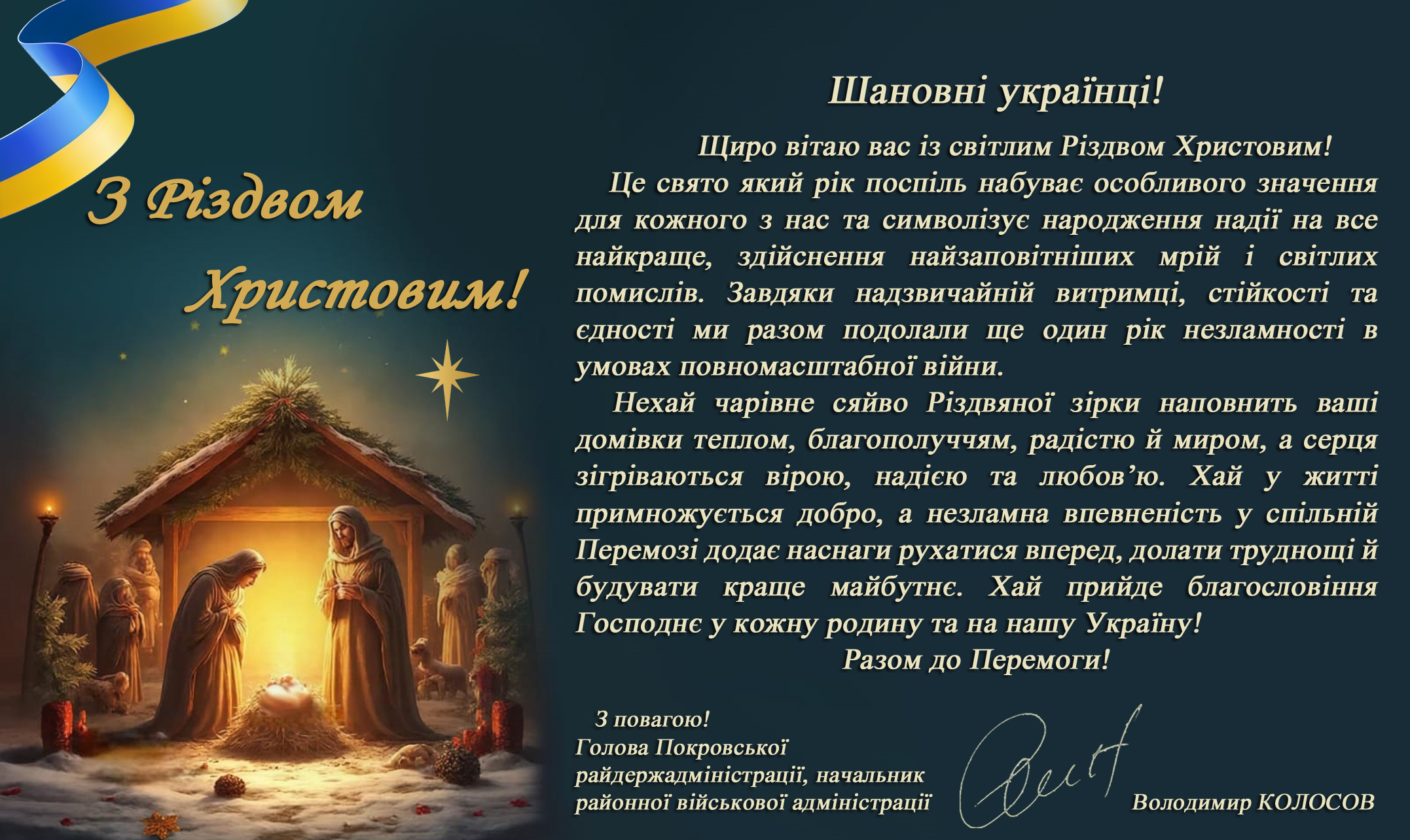print facebook Google+ Привітання голови Покровської райдержадміністрації, начальника районної військової адміністрації Володимира Колосова з Різдвом Христовим! 25.12.2025 в 8:30 Sorry, this entry is only available in Українська. print