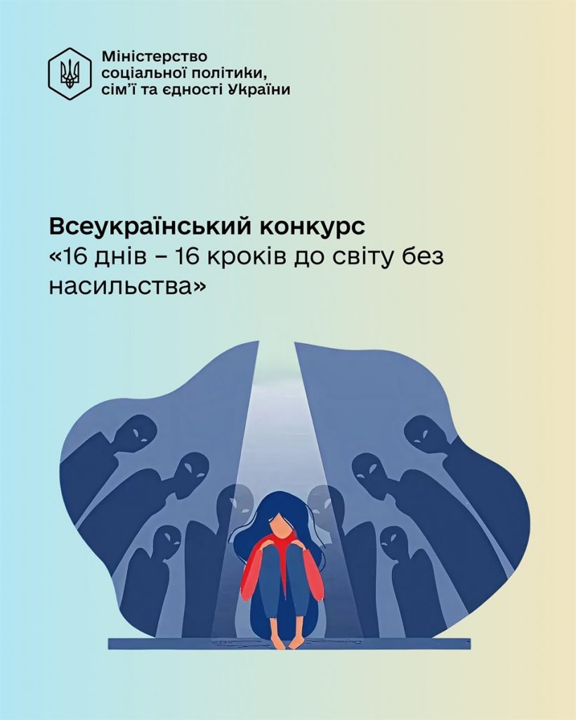 В Україні стартував творчий інформаційно-просвітницький конкурс для підлітків віком 15–17 років «16 днів – 16 кроків до світу без насильства». Його мета – підсилити голос молоді у темі запобігання насильству, сприяти формуванню культури безпечної поведінки, рівності, толерантності та взаємоповаги у школі, родині та громаді.