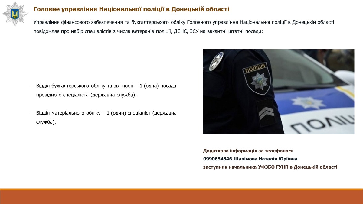 Управління фінансового забезпечення та бухгалтерського обліку Головного управління Національної поліції в Донецькій області повідомляє про набір спеціалістів з числа ветеранів поліції, ДСНС та Збройних Сил України на вакантні штатні посади:
