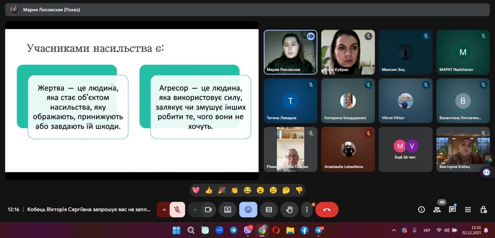 2 грудня 2025 року, до Всеукраїнської кампанії «16 днів проти насильства», з метою привернення уваги до проблем подолання насильства в сім’ях, жорстокого поводження з дітьми, протидії торгівлі людьми та захисту прав жінок, для учнівської молоді Покровського професійного ліцею було проведено виховну годину в режимі відеоконференції представниками відділу пробації міста Покровська та сектору ювенальної превенції Покровського РУП в Донецькій області.